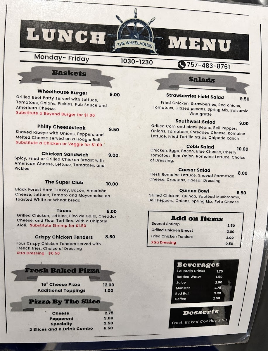 The Wheelhouse also boasts a friendly staff and a welcoming atmosphere, making it a perfect spot for a casual meal. With reasonable prices and a relaxed vibe, it's an exciting destination for anyone craving hearty, quality food.